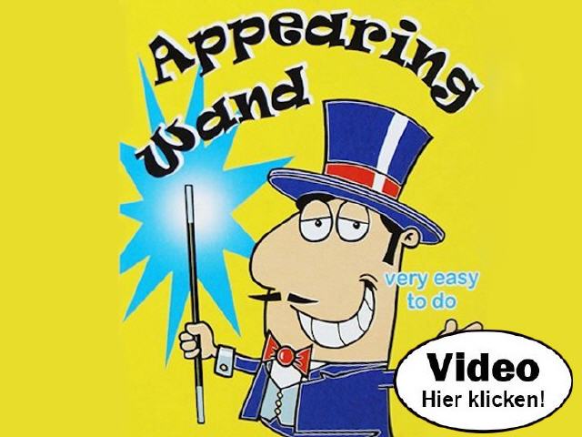 Der Zauberer lässt wie von Zauberhand einen 50 cm langen Zauberstab erscheinen! Der Zauberstab kann aus jedem beliebigen Ort hervorgeholt werden: aus den Händen, einer kleinen Tasche, dem Portemonnaie, dem Schuh, der Hosentasche, einem Hut … Ihrer Fantasie sind keine Grenzen gesetzt!