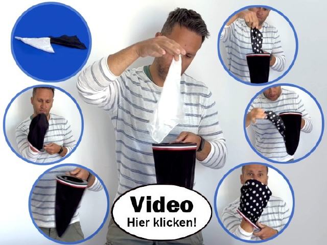 Aber damit ist es noch nicht genug: Der Zauberer nimmt das schwarze Tuch mit den weißen Punkten und streicht es ein paar Mal sanft gegen den Beutel ... wie von Zauberhand verwandelt sich auch das Innere des Beutels: Der Stoff des Beutels ist jetzt ebenfalls schwarz mit weißen Punkten, genau wie das Seidentuch!
