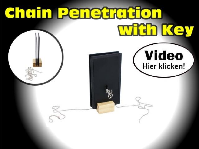 Unglaublich, denn wenn man die Kette an beiden Enden nach oben zieht, „schmilzt“ diese auf magische Weise durch den geheimnisvollen massiven Schlüssel hindurch und ist frei!