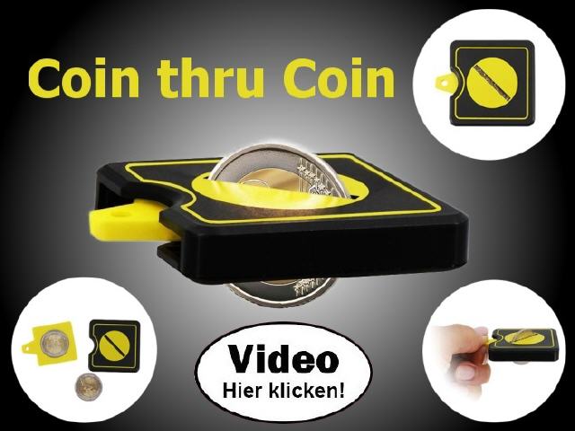 Dann nimmt der Vorführende eine zweite Münze, schiebt diese in den Schlitz... und sie durchdringt auf magische Weise die erste Münze!
