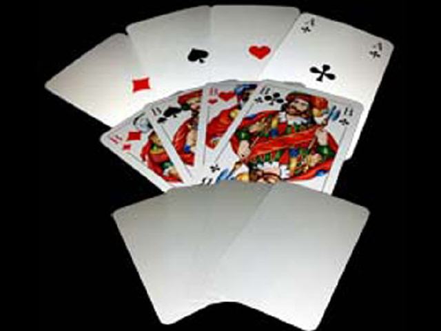Vier weiße, unbedruckte Karten - davon wird eine Karte gegen ein Ass ausgetauscht. Die vier Karten werden aufgefächert: die Blankokarten haben sich in vier Asse verwandelt ...