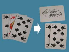Der Vorführende zeigt 3 Karten gefächert vor. Die mittlere Karte ist ein König und hat ein Rückenmuster, das von dem der beiden anderen Karten klar zu unterscheiden ist. Der König wird - Rückseite nach oben - auf den Tisch gelegt. Die beiden anderen Karten werden nochmals vorgezeigt und in die Tasche gesteckt. Nun behauptet der Künstler, er wolle den König - obwohl die Zuschauer ihn selbst auf den Tisch gelegt hätten - ohne ihn zu berühren verschwinden lassen. Ungläubige Gesichter ! "Bitte", sagt der Künstler, "drehen Sie den König mit der Bildseite nach oben, damit Sie das Verschwinden besser beobachten können!". Ein Zuschauer dreht die Karte um und stellt fest, das der König schon "von der Bildfläche verschwunden" ist. Doch hat er als korrekter Monarch eine Nachricht hinterlassen: "Habe soeben abgedankt!"