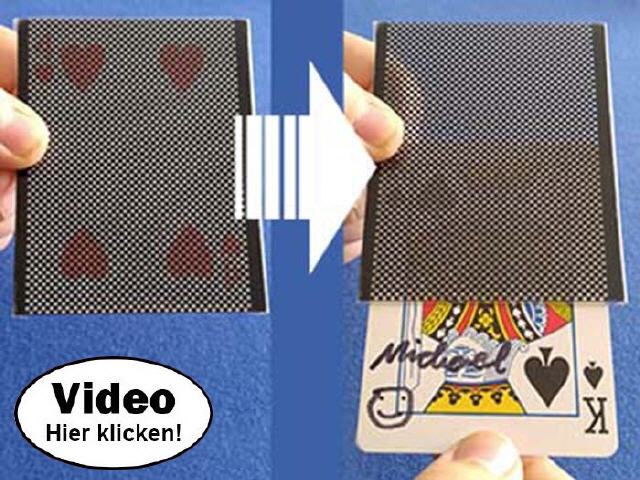 Bitten Sie um etwas Ruhe. Konzentration. Es ist kaum zu glauben, was Ihre Zuschauer nun sehen werden: Die Karte im Etui (Herz 4) verwandelt sich jetzt sichtbar, wie in Zeitlupe in die Zuschauerkarte (Pik König), die alle vom Zuschauer gemachten Kennzeichnungen trägt. Das ist sichtbare Magie!