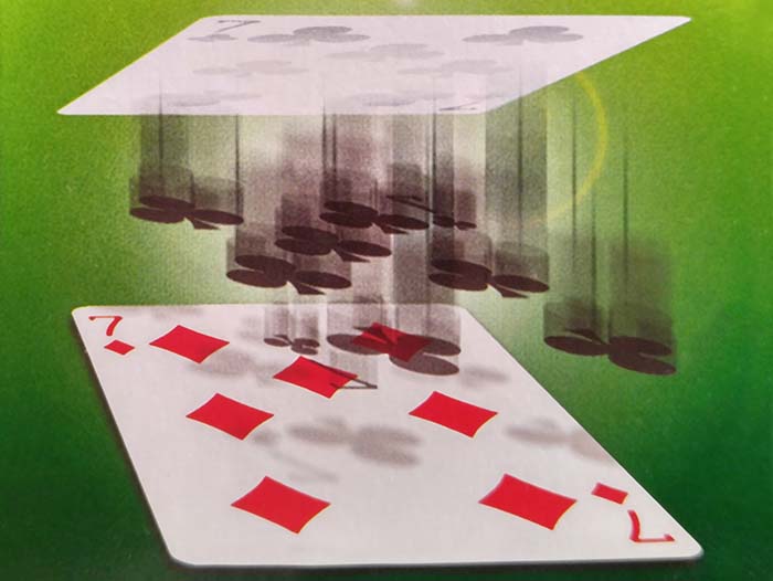 Sie zeigen Ihrem Publikum zwei Spielkarten (Kreuz 7 und die Karo 7) vor. Die Karo 7 kommt zuerst offen auf den Tisch. Dann wird die andere Karte daraufgelegt.